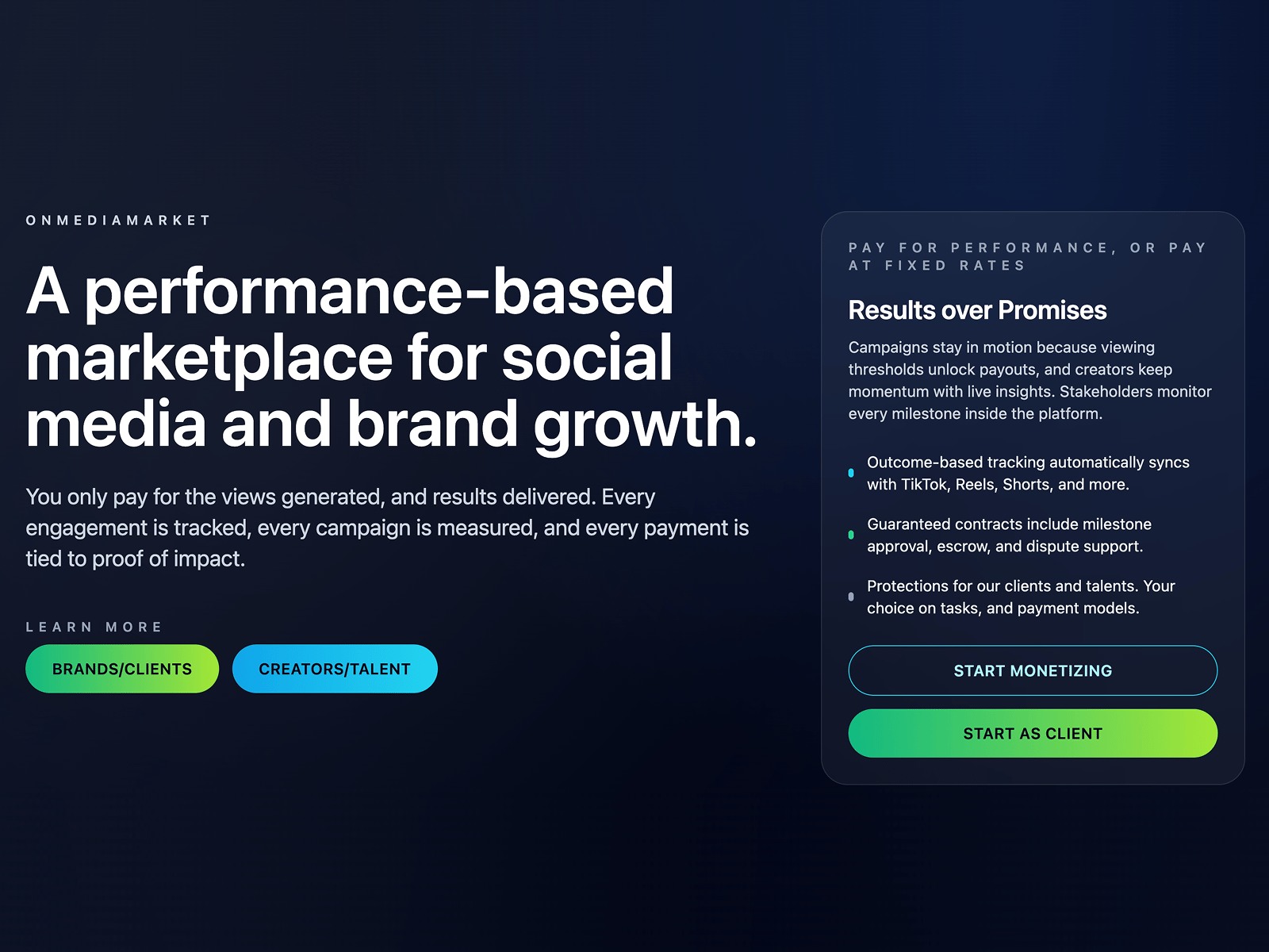 onmediamarket is a performance-based marketplace that connects brands with creators, marketers, and content specialists and lets you choose exactly how you pay. You can set fixed-rate deals with clear deliverables, or tie payments directly to views and measurable outcomes. No retainers. No empty invoices. Just work that earns its payout. Funds sit in escrow until milestones are met, outcome tracking syncs automatically with TikTok, Reels, Shorts, and more, and a dispute system handles disagreements if they arise. Built for founders, startups, and brands of any size, onmediamarket keeps your marketing budget tied to real impact.
