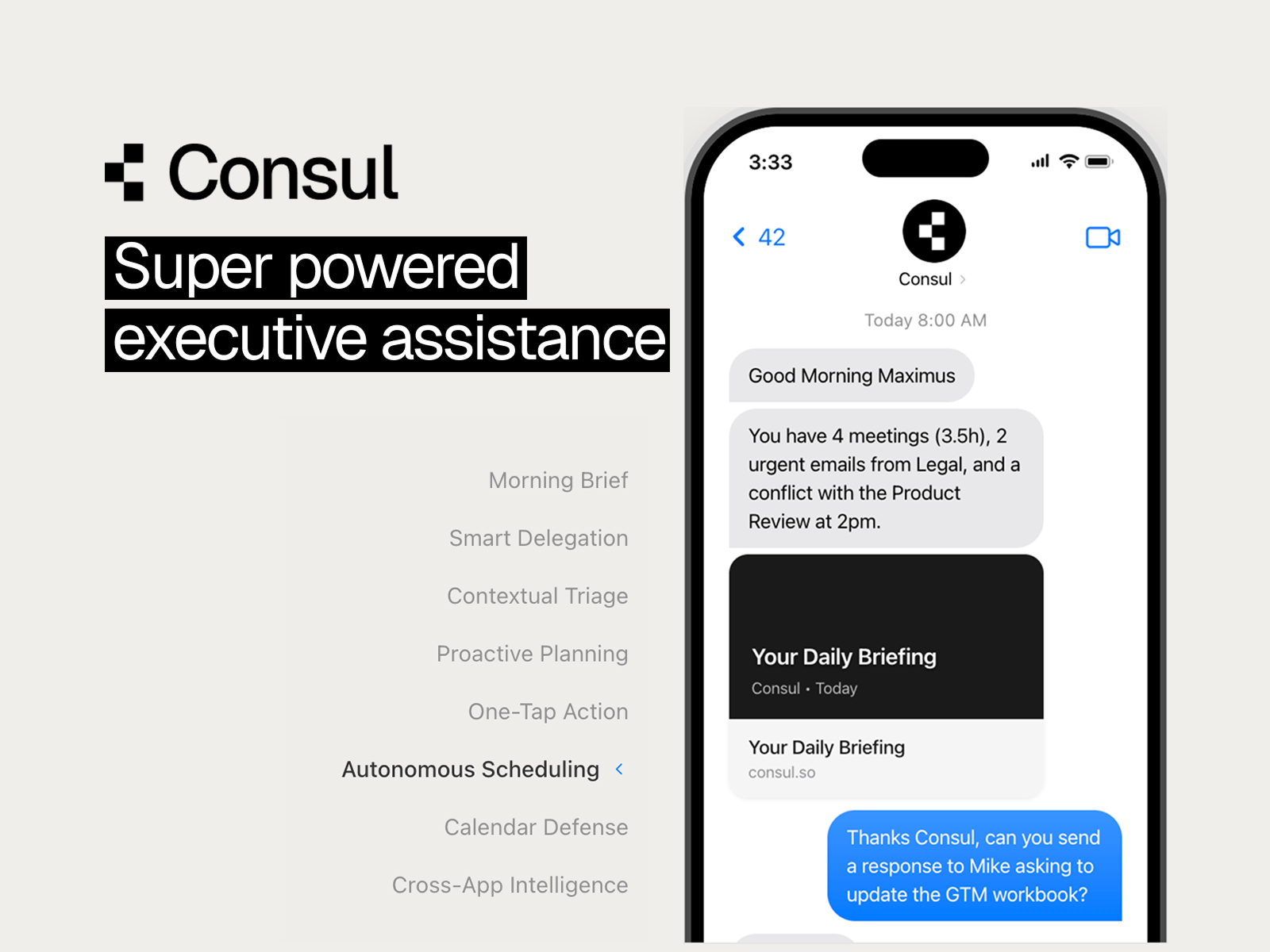 Quick take: If you're spending your mornings sorting email and chasing meeting times instead of building or leading, Consul could give you back the hours you need to do your actual job.