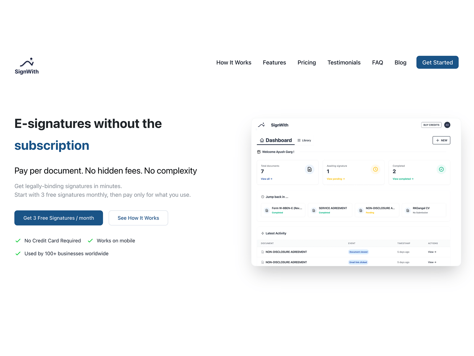 SignWith gets your documents signed without locking you into a subscription. Upload your PDF, place signature fields, and send. Recipients sign with a few clicks from any device, no account required on their end. No bloated dashboards. No confusing tiers. Just a clean, simple signing flow with a complete audit trail on every document. Built for freelancers, consultants, accountants, and small business owners, SignWith keeps the cost tied to actual usage, not a calendar.